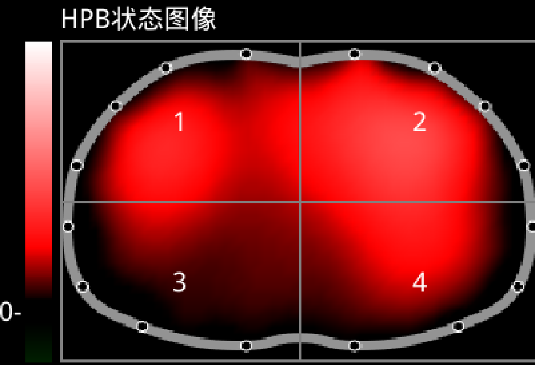 图七 第二次介入取栓后的EIT影像缺损已明显恢复,各ROI的L/H分布趋于均匀